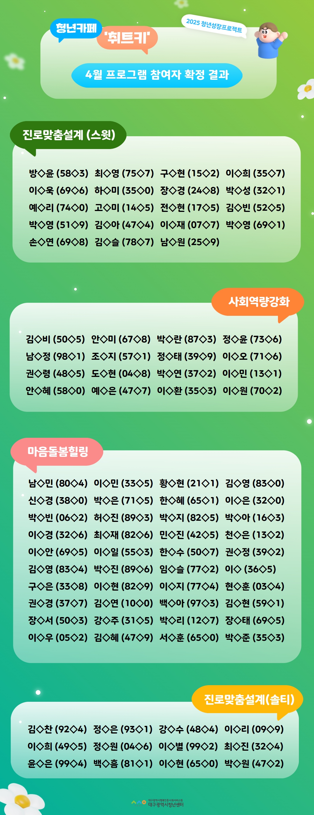 [센터사업] 2025 청년성장프로젝트 청년카페 '취트키' 4월 프로그램 참여자 확정결과