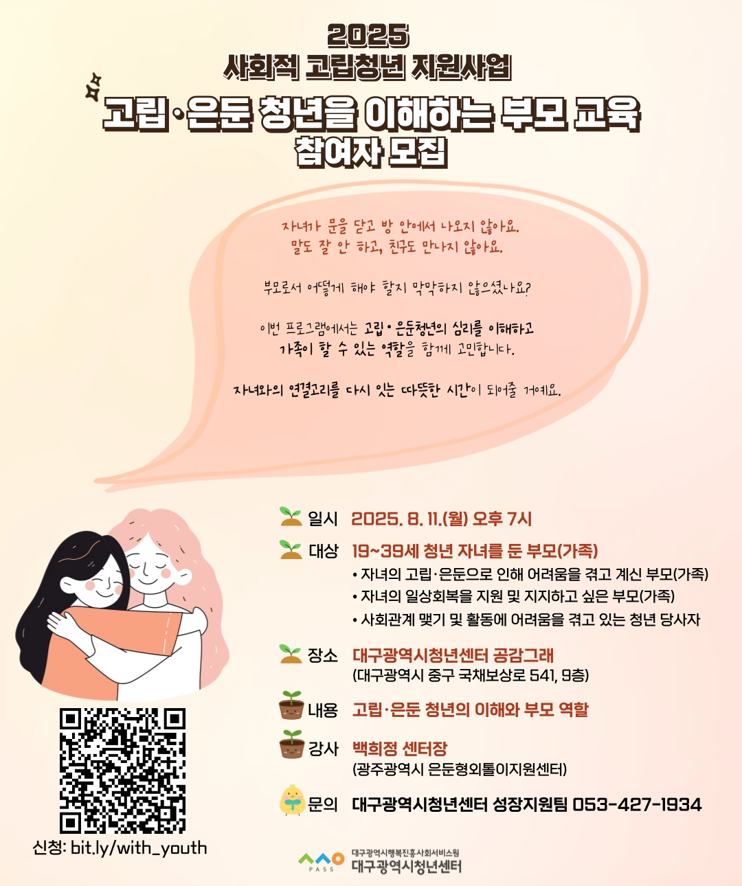 2025 사회적 고립청년 지원사업 <고립·은둔 청년을 이해하는 부모교육> 참여자 모집