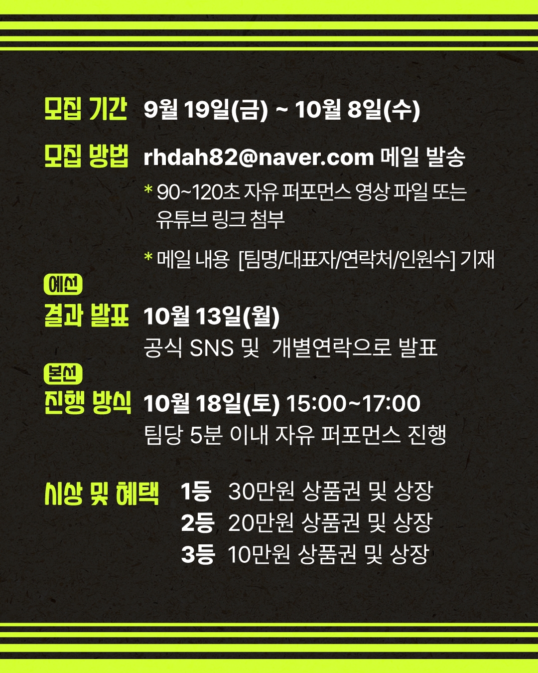 - 신청방법 : 90 ~ 120초 자유 퍼포먼스 영상 파일 또는 유튜브 링크 첨부하여 메일 발송 (rhdah82@naver.com)