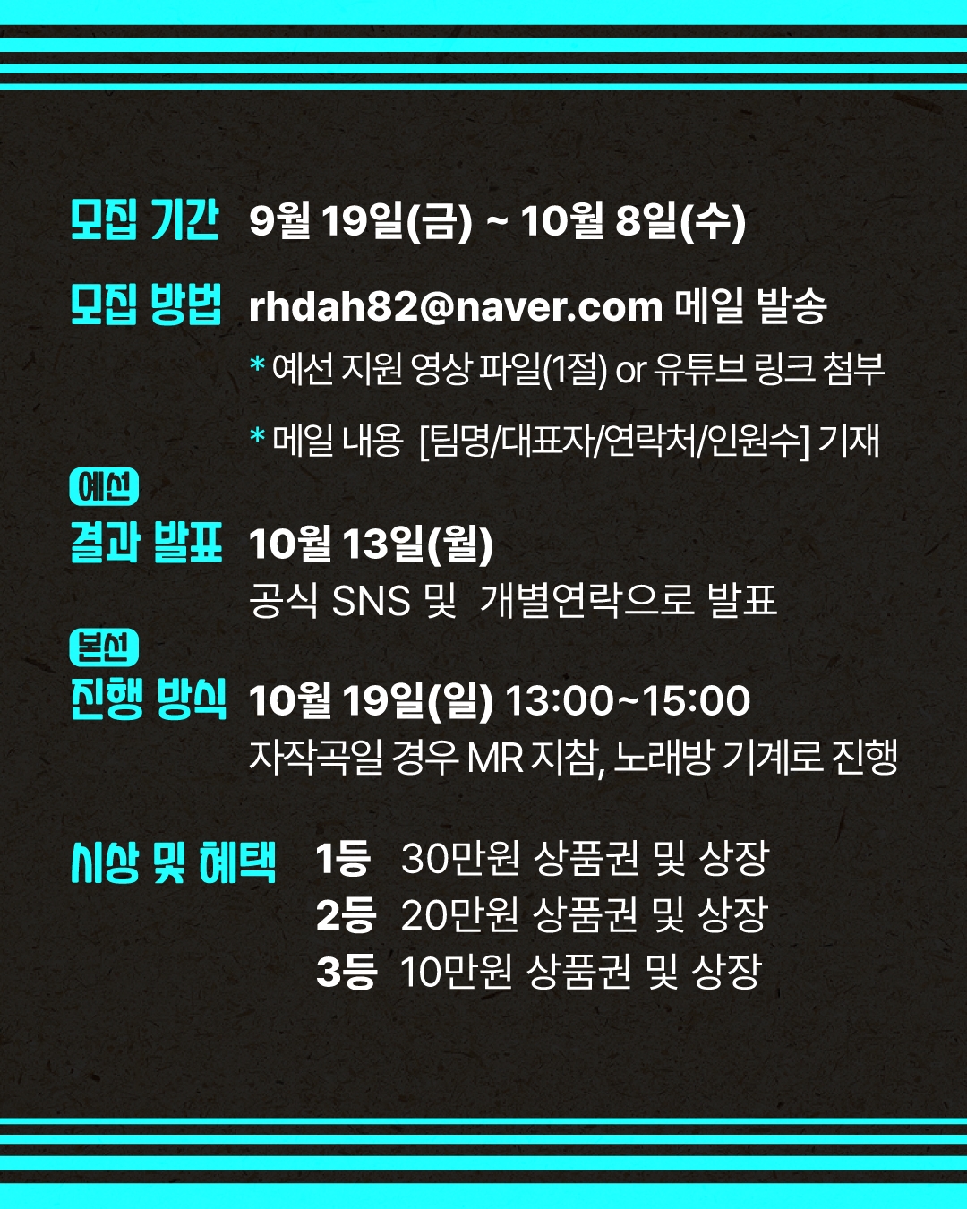 - 신청방법 : 예선 지원 영상 파일(1절) 또는 유튜브 링크 첨부하여 메일 발송 (rhdah82@naver.com)