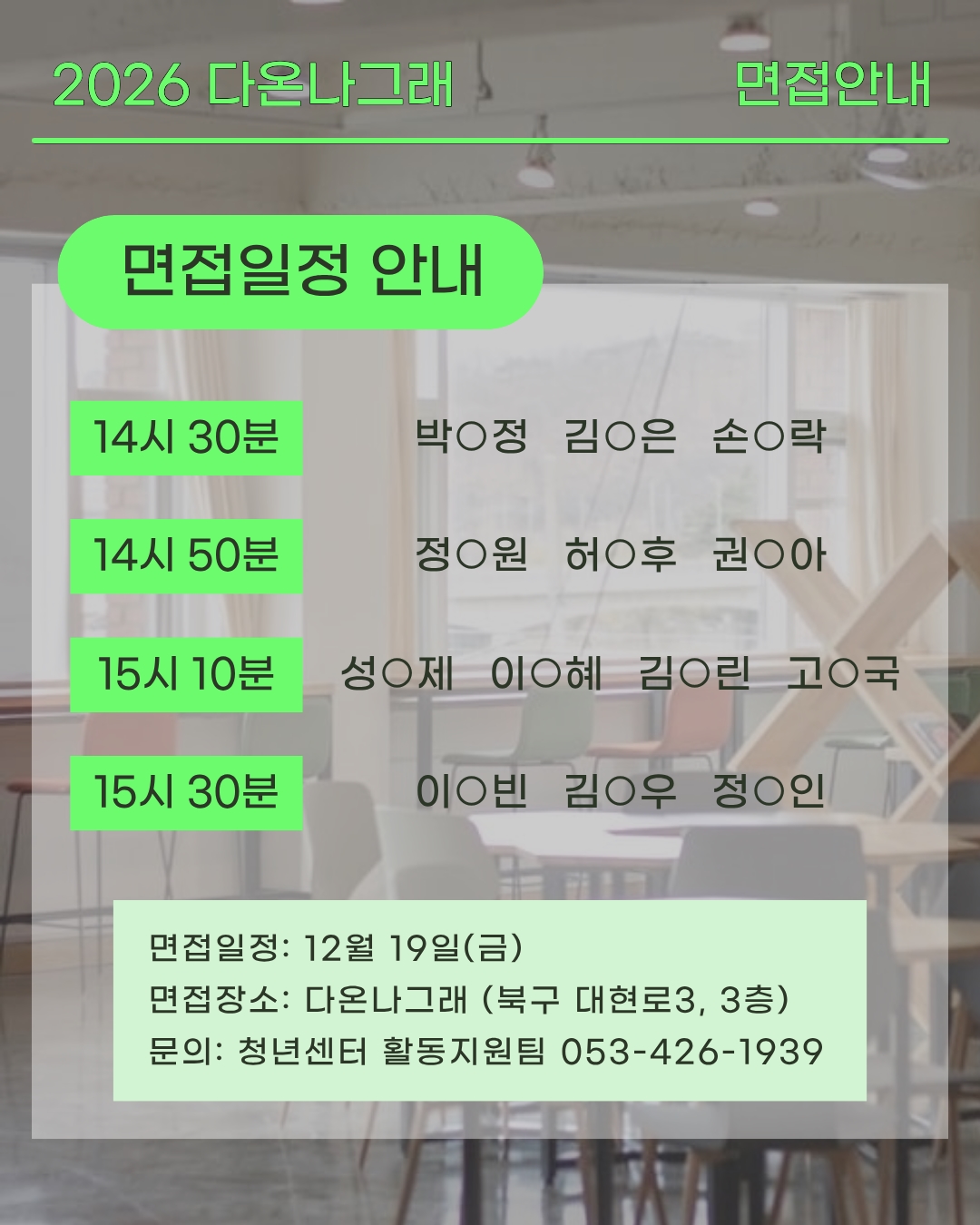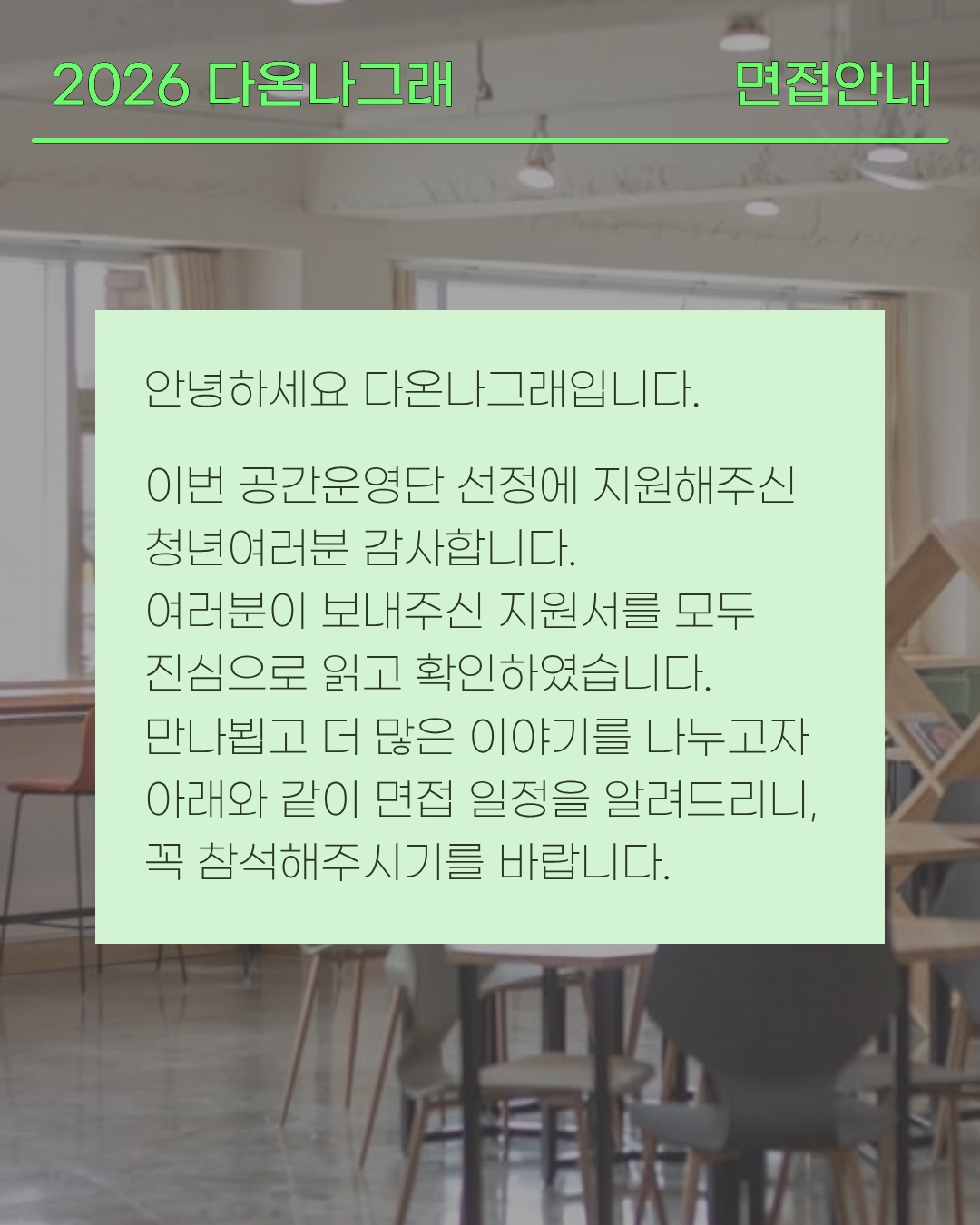 [공지] [센터사업] 청년활력공간 다온나그래 공간운영단 면접안내