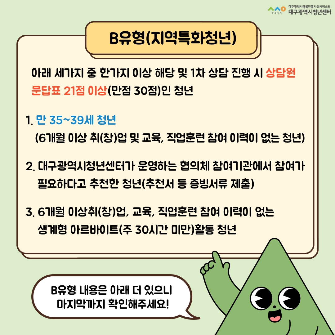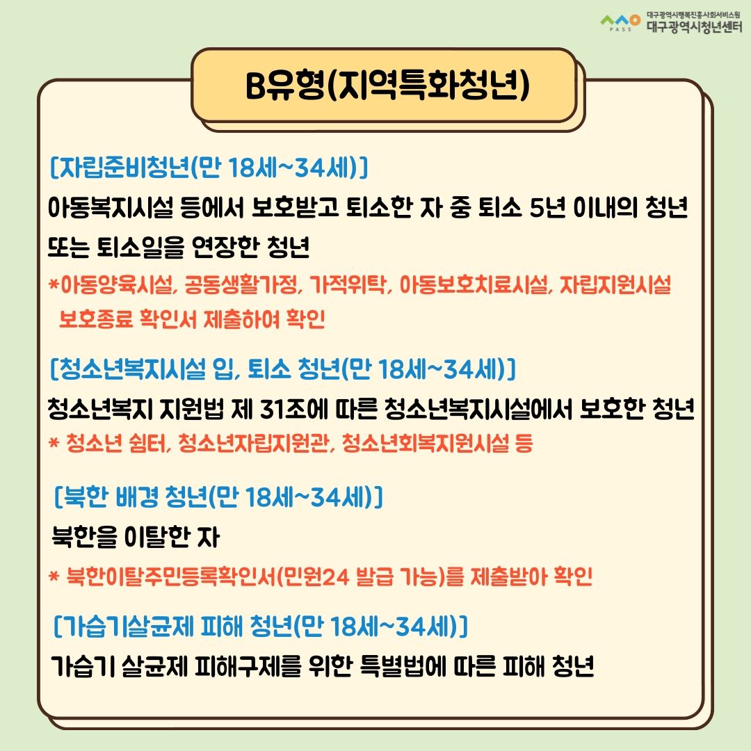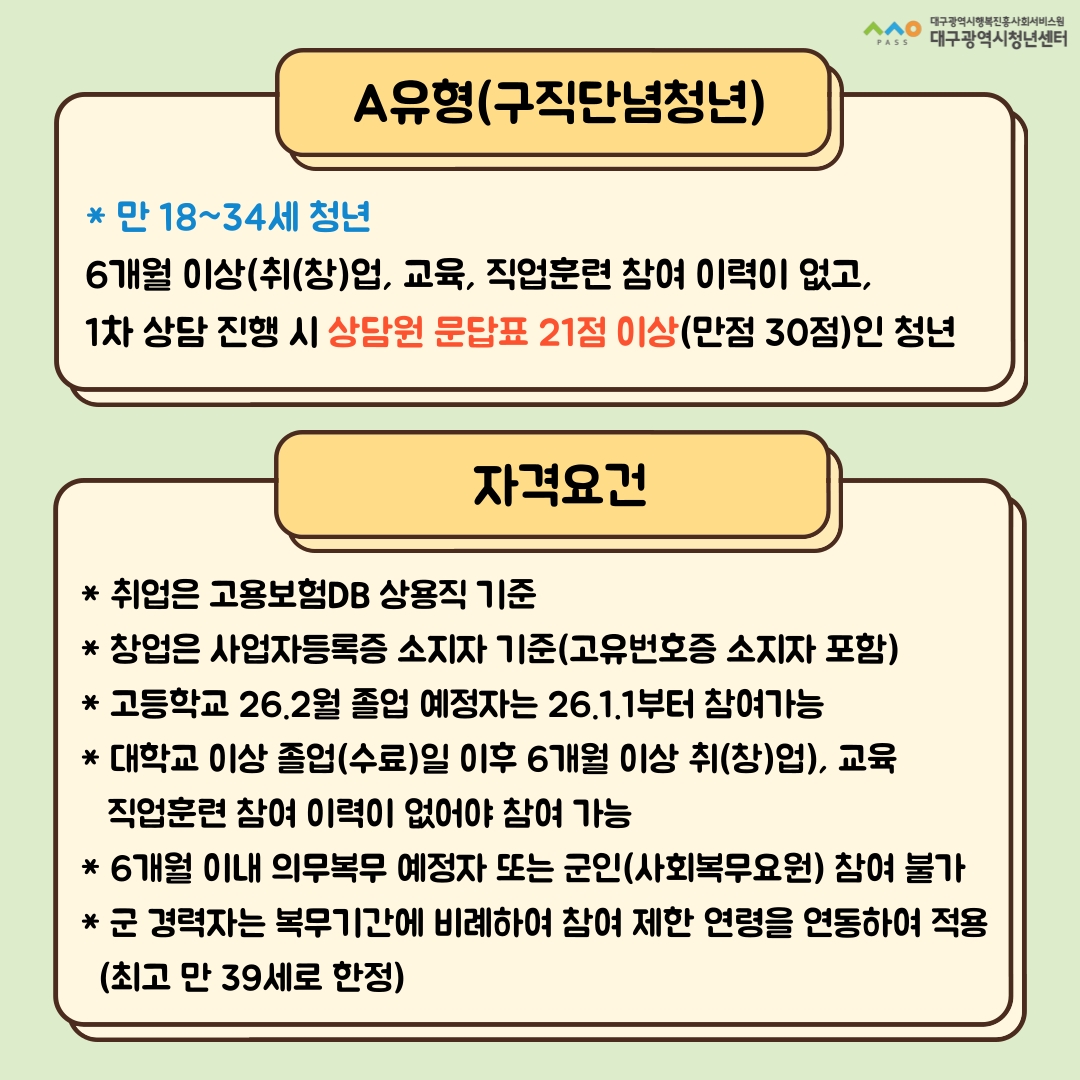 A유형 신청 | 1.고용24 청년도전지원사업 신청 ※ 신청기관 대구광역시청년센터 선택 2. 청년센터에서 접수 처리 후 프로그램 개별 안내 - 구직문답표 작성 개별 안내를 통한 프로그램 진행 일정 선택 |