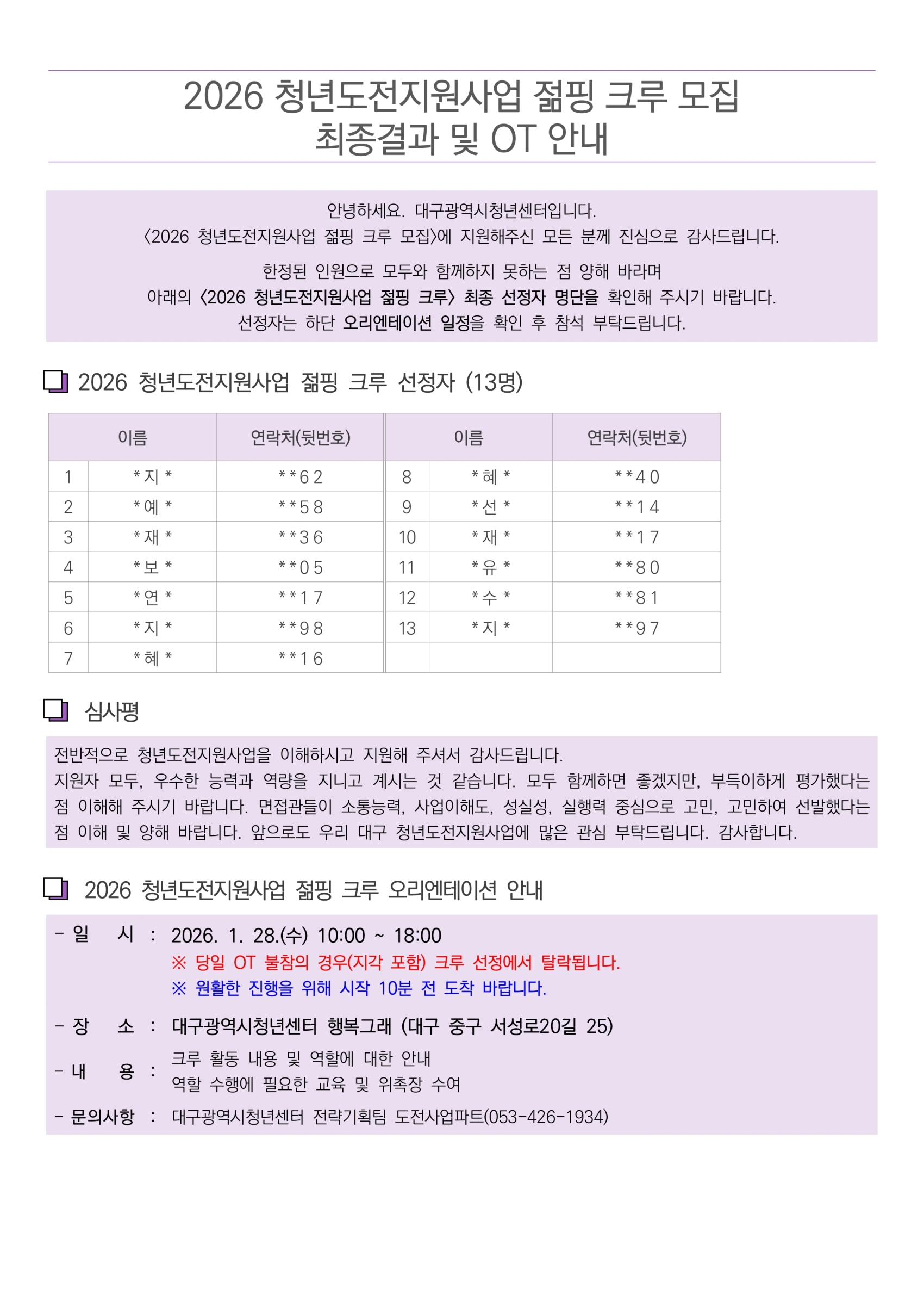 2026 청년도전지원사업 젊핑 크루 선정 심사 결과 발표