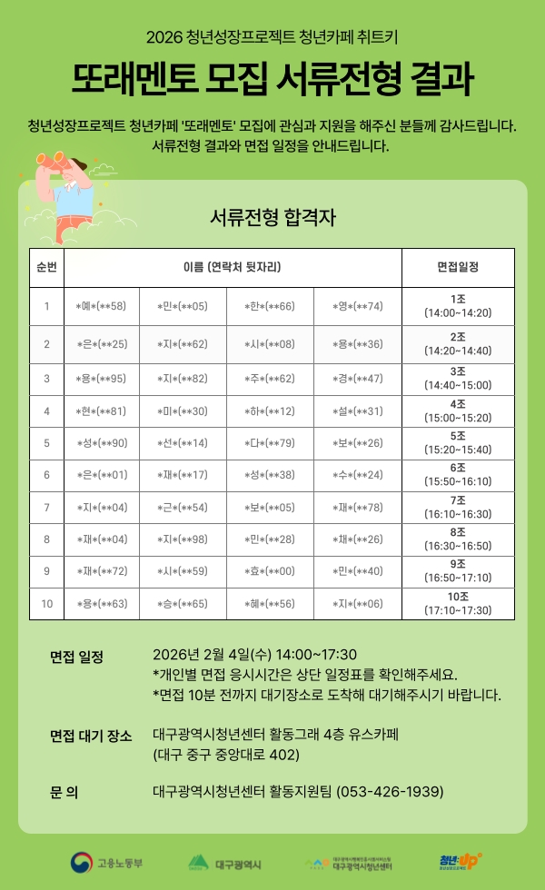 [공지] [센터사업] 2026 청년성장프로젝트 청년카페 취트키 또래멘토 모집 서류전형 결과안내