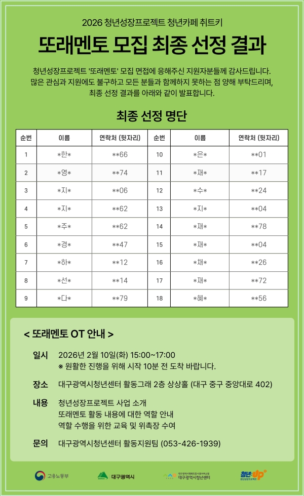 [센터사업] 2026 청년성장프로젝트 청년카페 취트키 또래멘토 모집 서류전형 결과안내2026-02-03