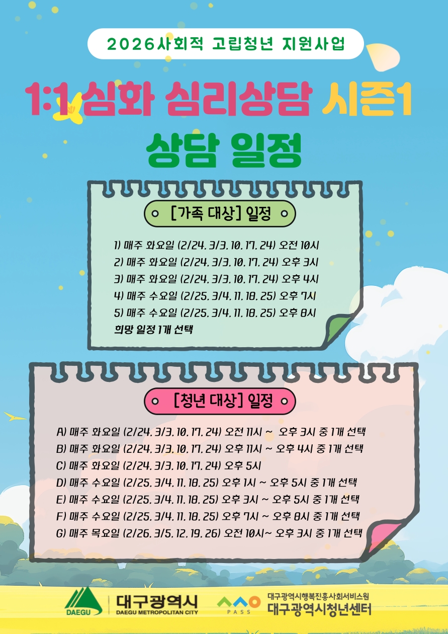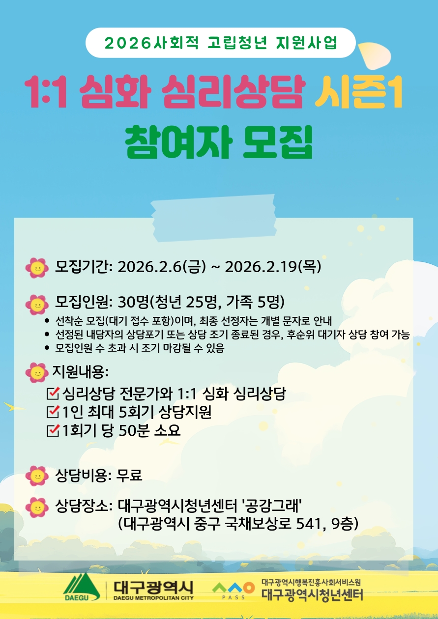 3. 모집대상 : 정서·사회적 고립으로 심리상담 지원이 필요한 대구 거주 19세~39세 청년 및 가족