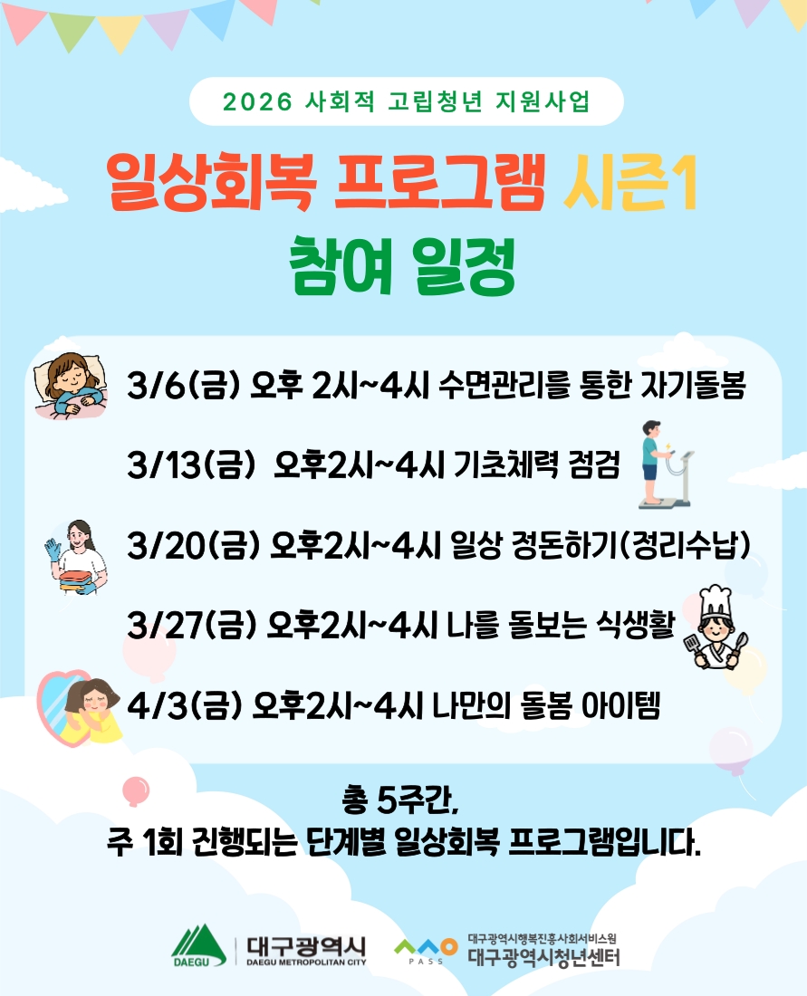 ▶ 모집대상 : 정서·사회적 고립으로 인한 어려움을 경험하고, 규칙적인 일상생활 회복을 하는 대구 거주 19세~39세 청년