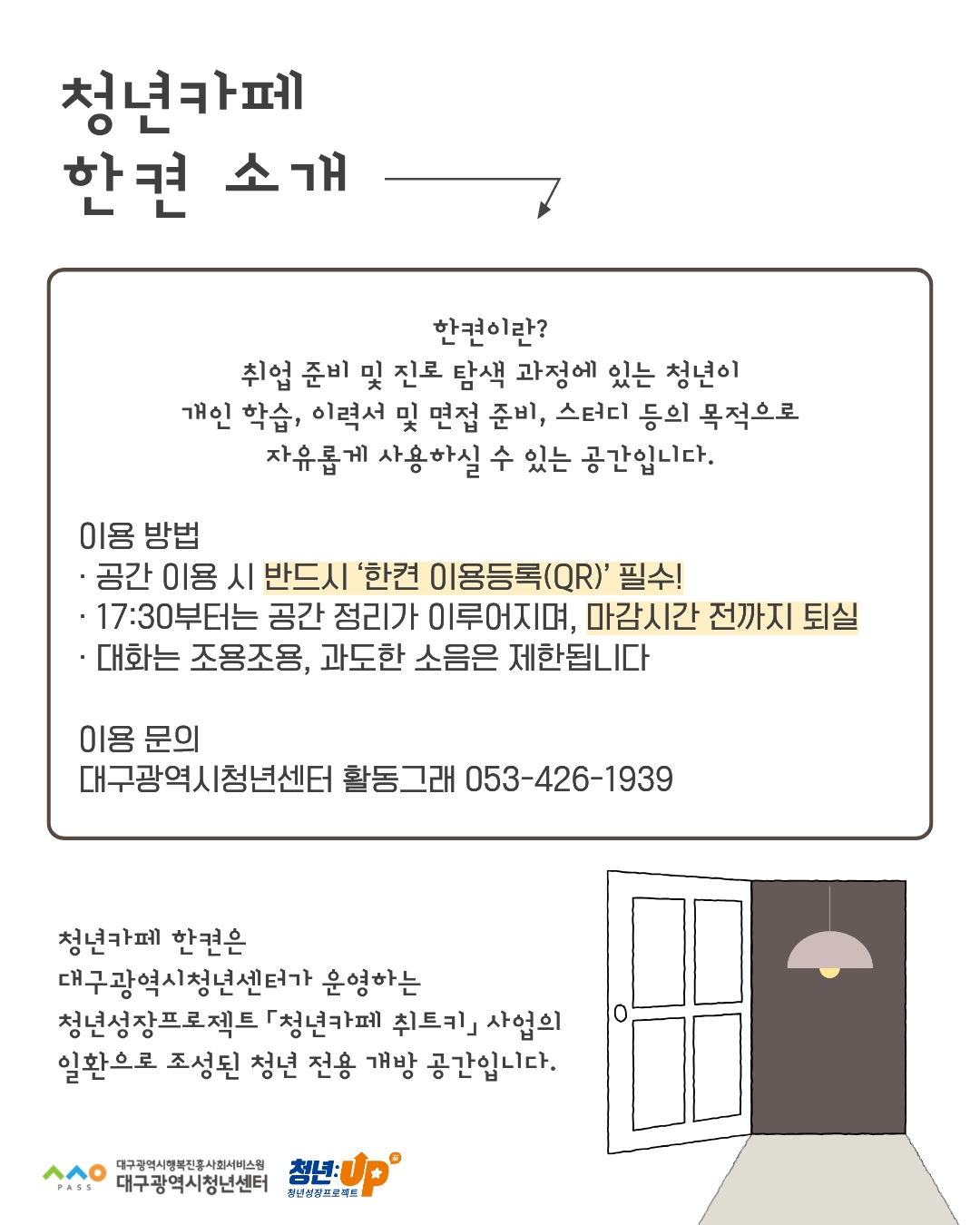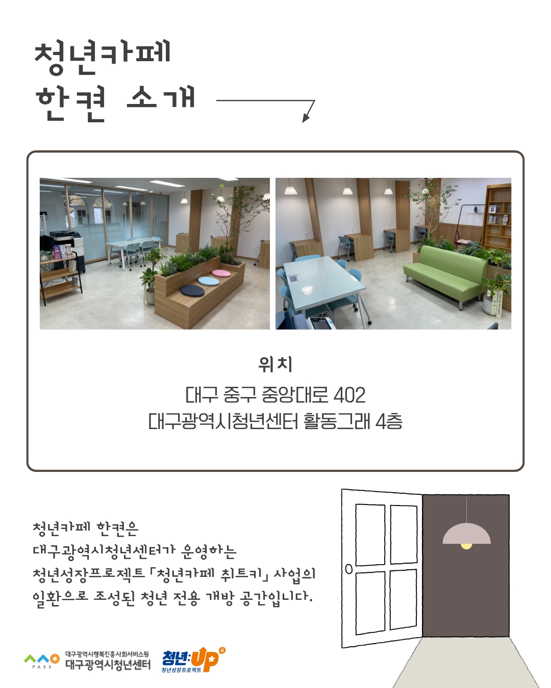 ※ 본 공간은 청년성장프로젝트 청년카페 취트키 사업의 일환으로 조성된 '청년 전용 개방 공간'입니다.