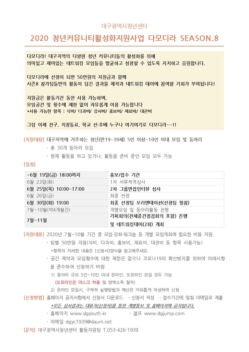 2020 청년커뮤니티활성화프로젝트 <다모디라 시즌8> 모집공고